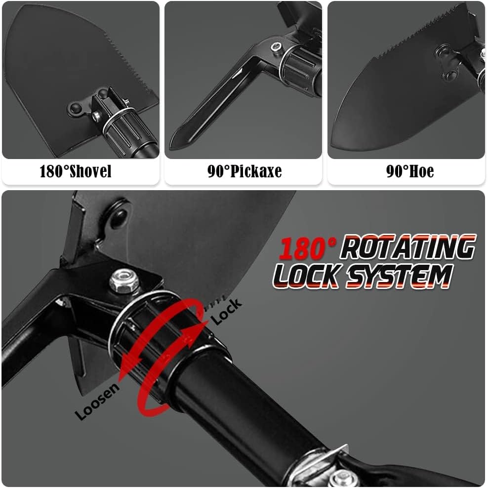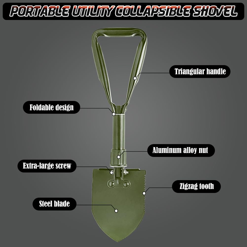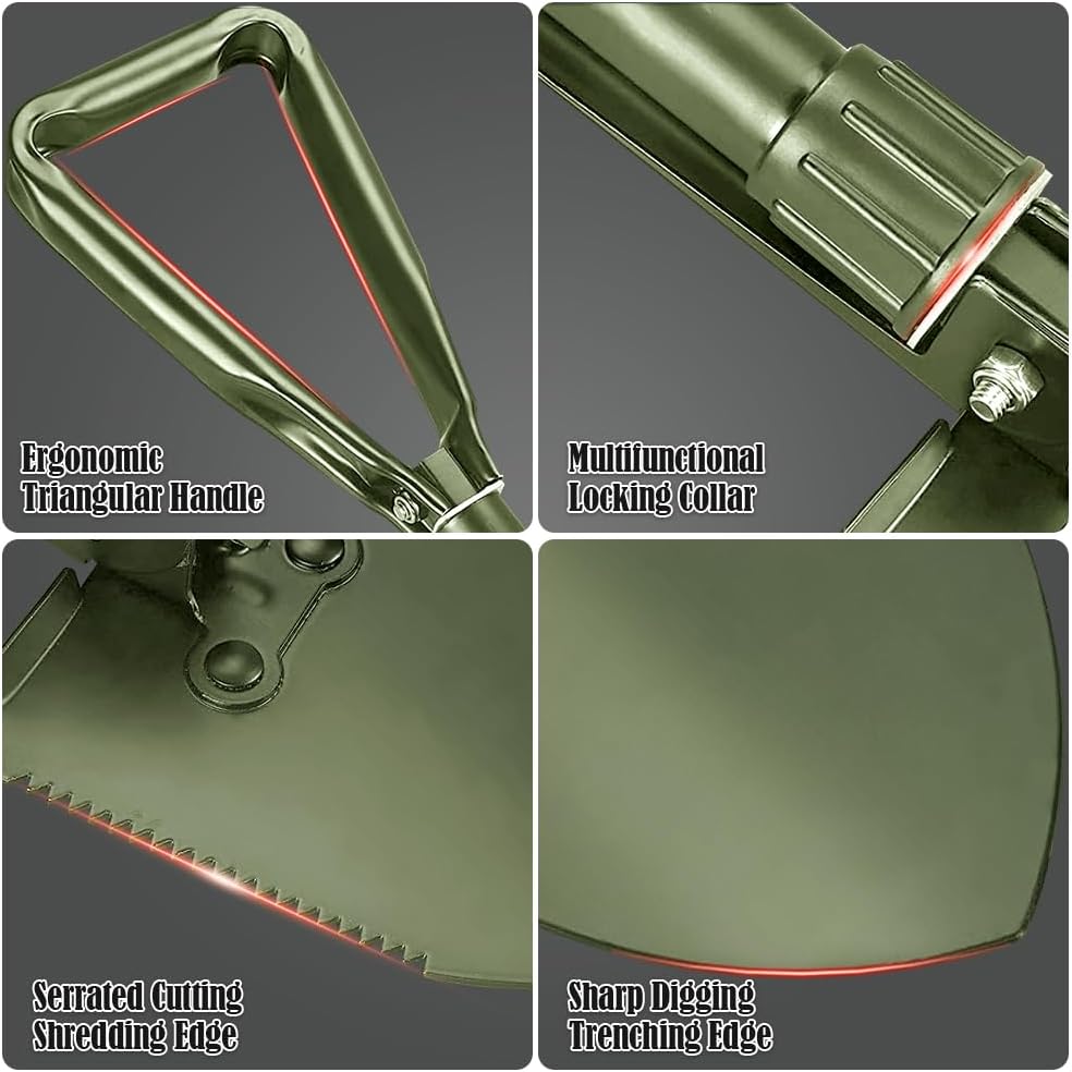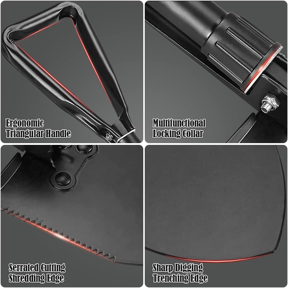 - 【Collapsible and Portable Design】The folding shovel uses aluminum alloy screw articulation, which can be folded in 3 directions by rotating the nut, making the shovel more compact and small, not taking up space and easy to carry; triangular handle design, with a large force area, provides a good grip
