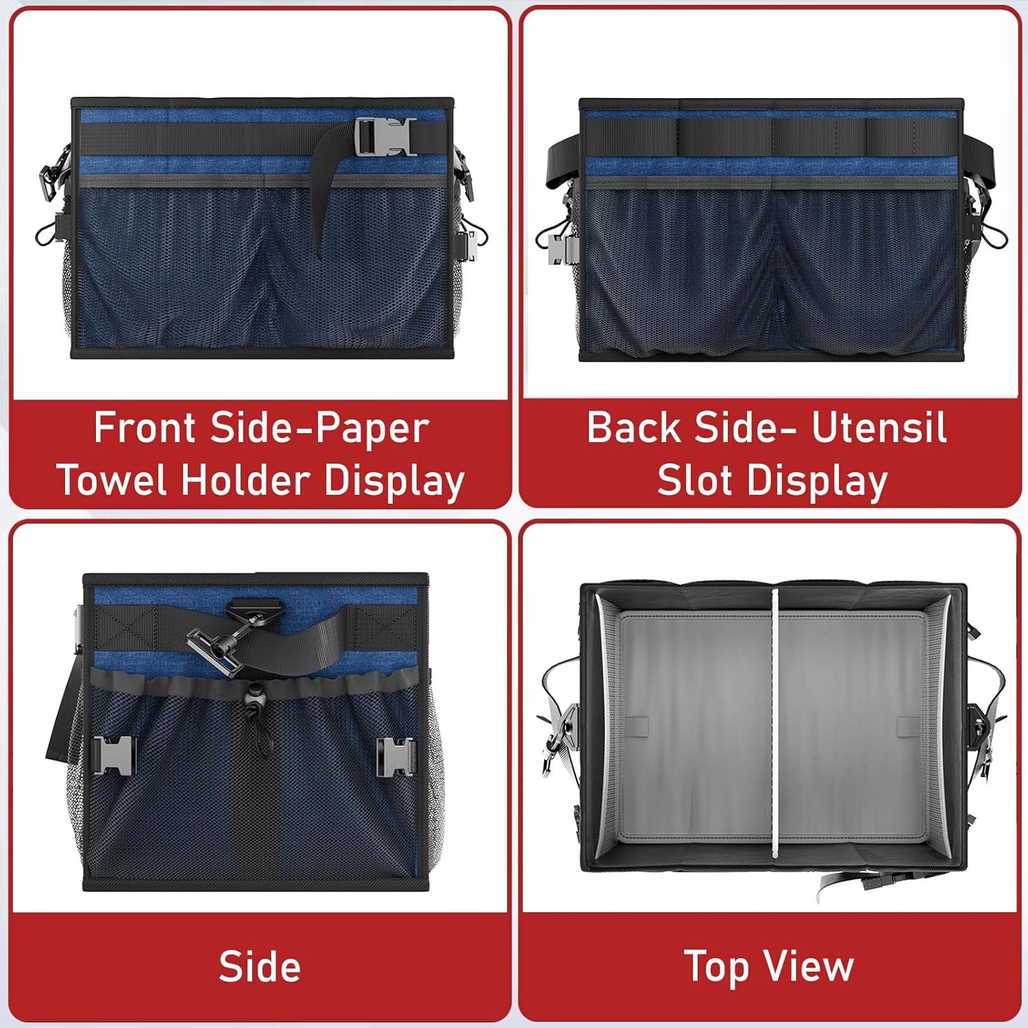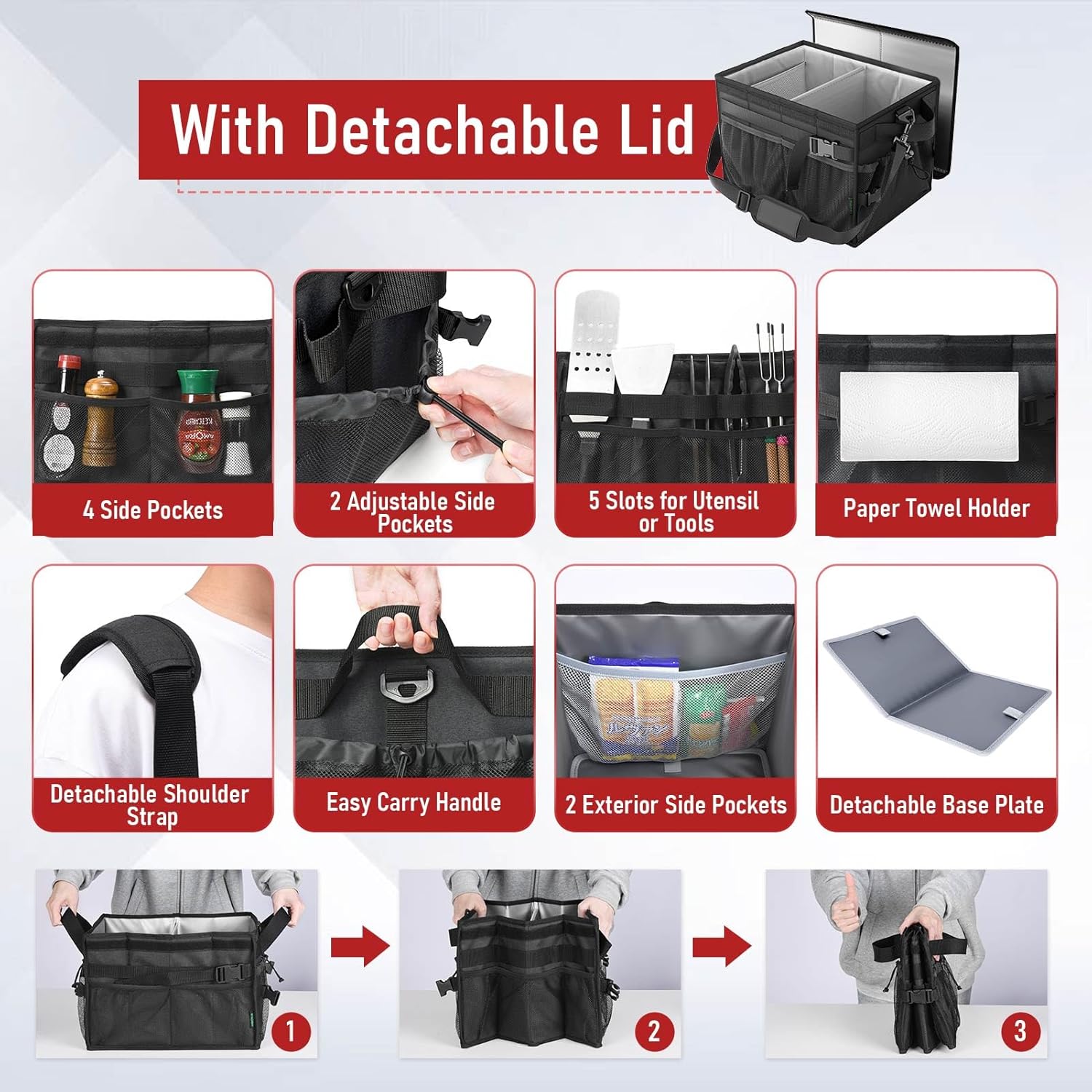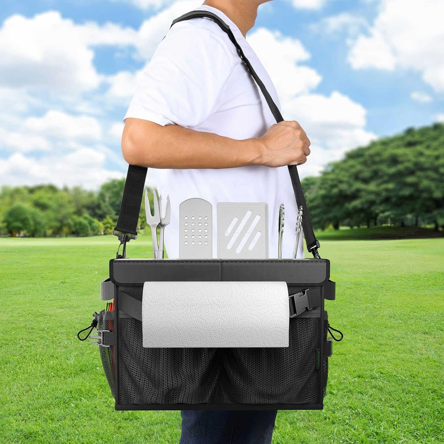 - Easy Carry & Versatile- Features with a detachable padded shoulder strap and easy carry handle for your convenience, make carrying stuff in and out to outdoor activities much easier, saves your time repeated between grill and your kitchen, a great table tool caddy for grilling, picnic, patio, camping, barbecue, outdoor dinner, griddle, rv, also a great gift for grilling lover and camper