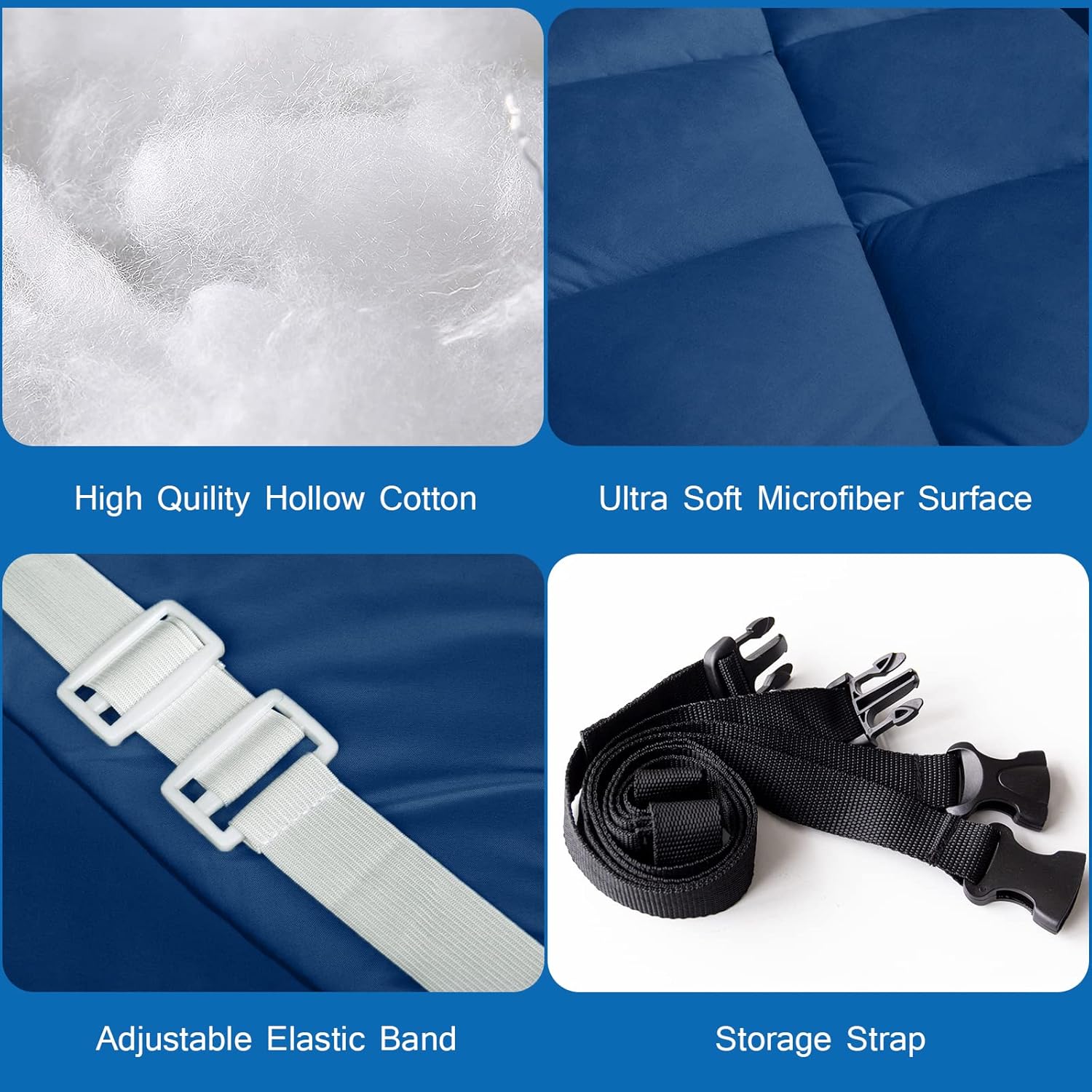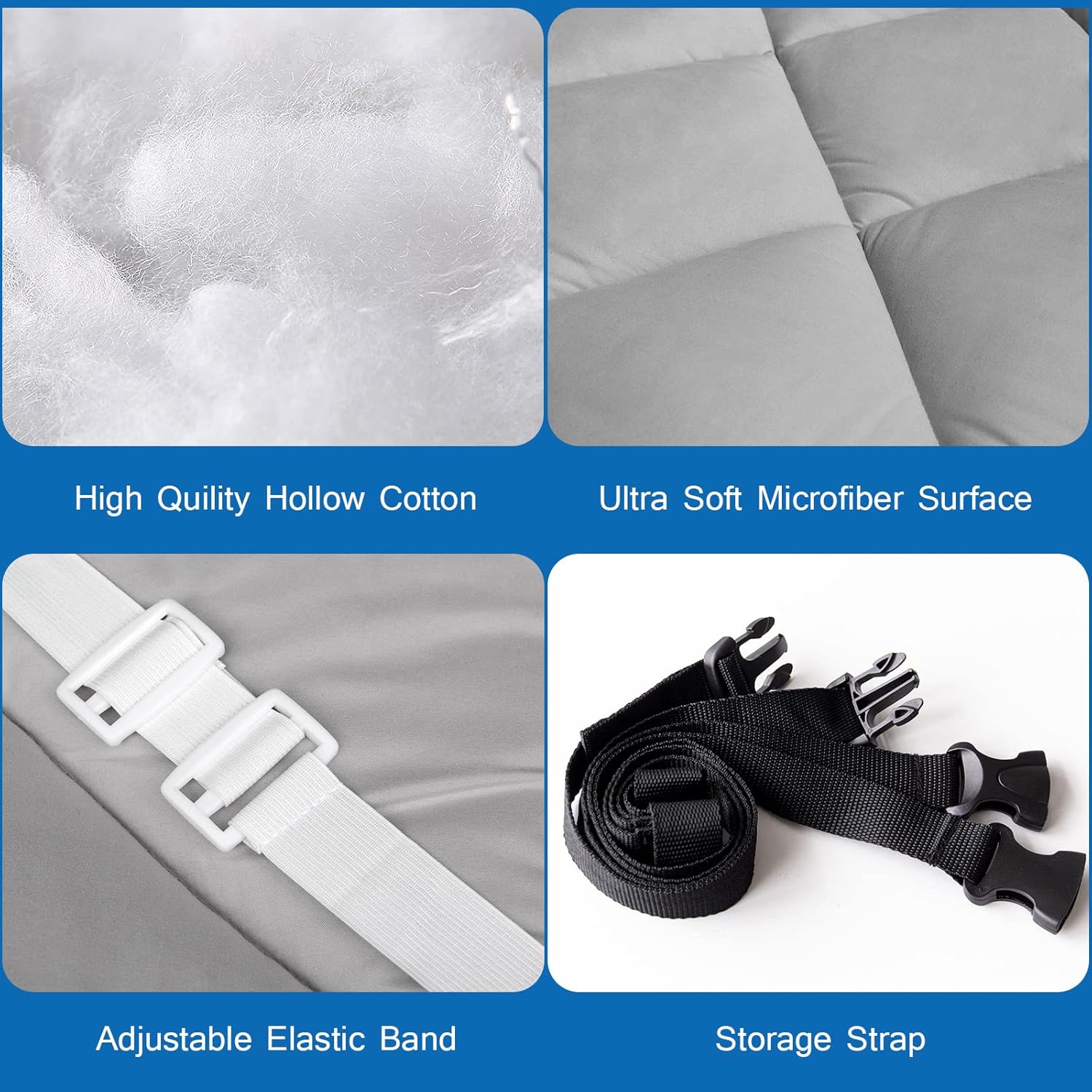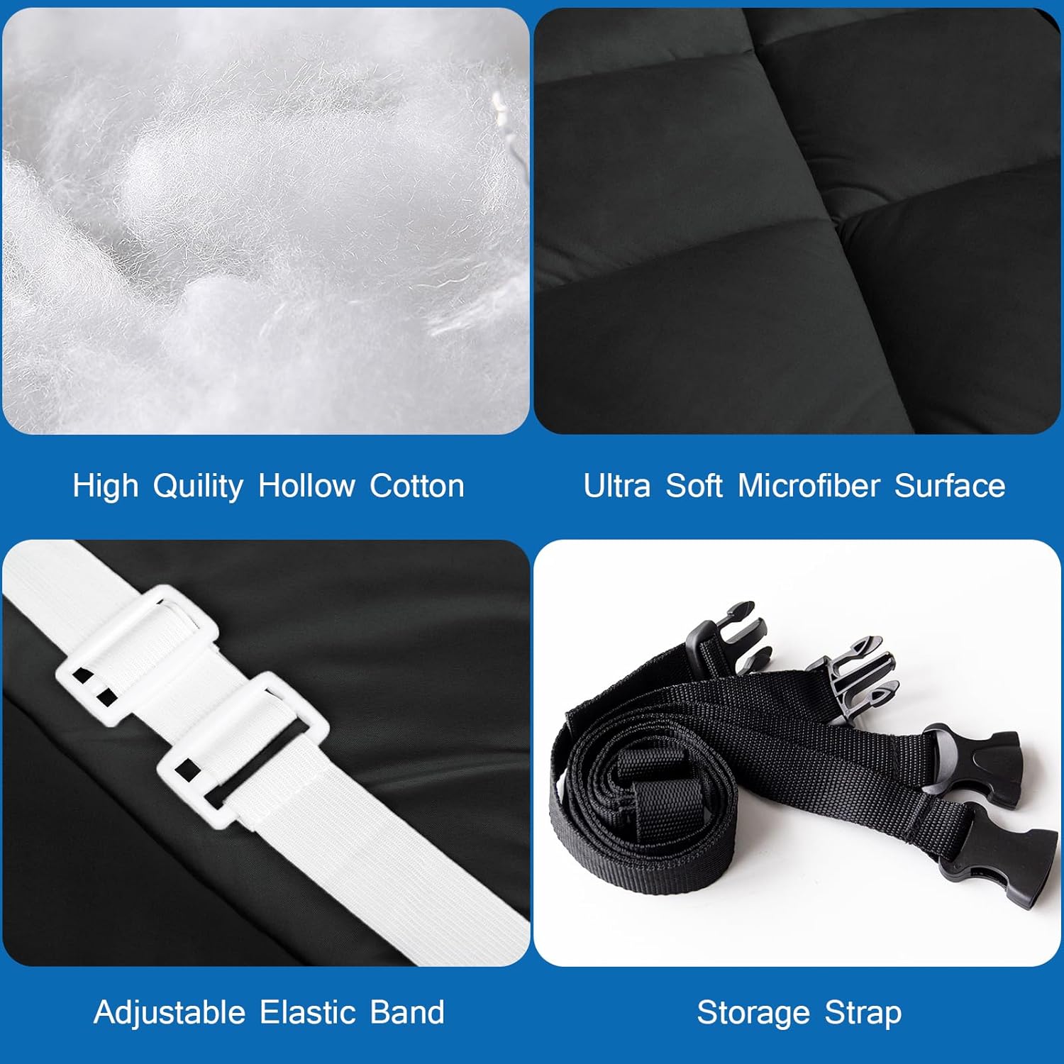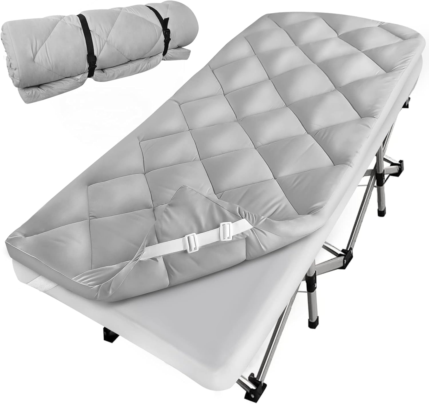 • Non-Slip Design: The camping sleeping pad is thoughtfully designed with slip resistant fabric ensure the cot pad stays in place. The four corners of the cot mattress topper is made up of 4 adjustable elastic straps, which will fix the cot well even if your cot size is slightly larger than the mattress's.