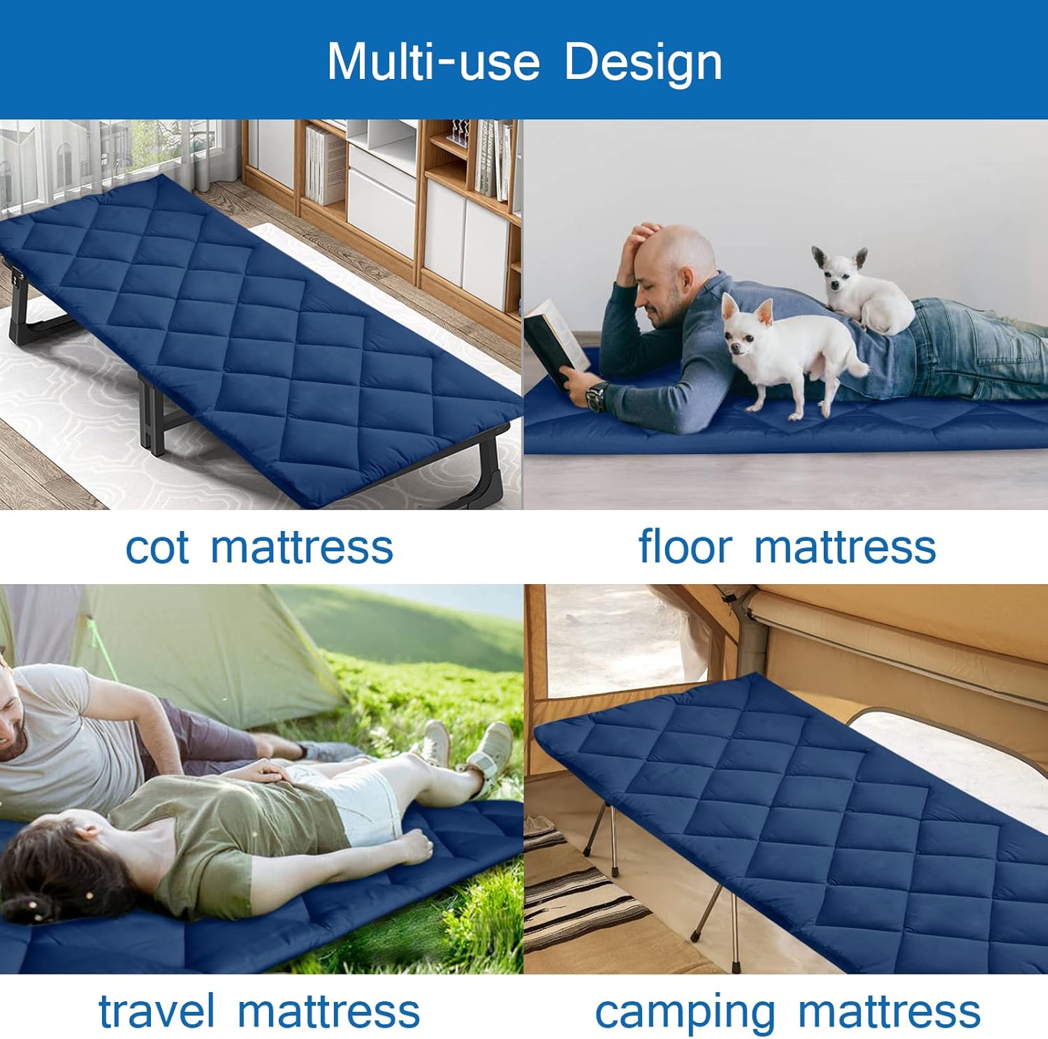 • Multi-Use Design: The cot mattress topper can fit up to most camping cots, including flat cots, cots with elevated head, folding cots with pillow, lounge chaise chairs. The cot pads for camping also perfect for any outdoor activity like traveling or car camping for family, indoor use for house guest bed, floor mattress and kids play mat.