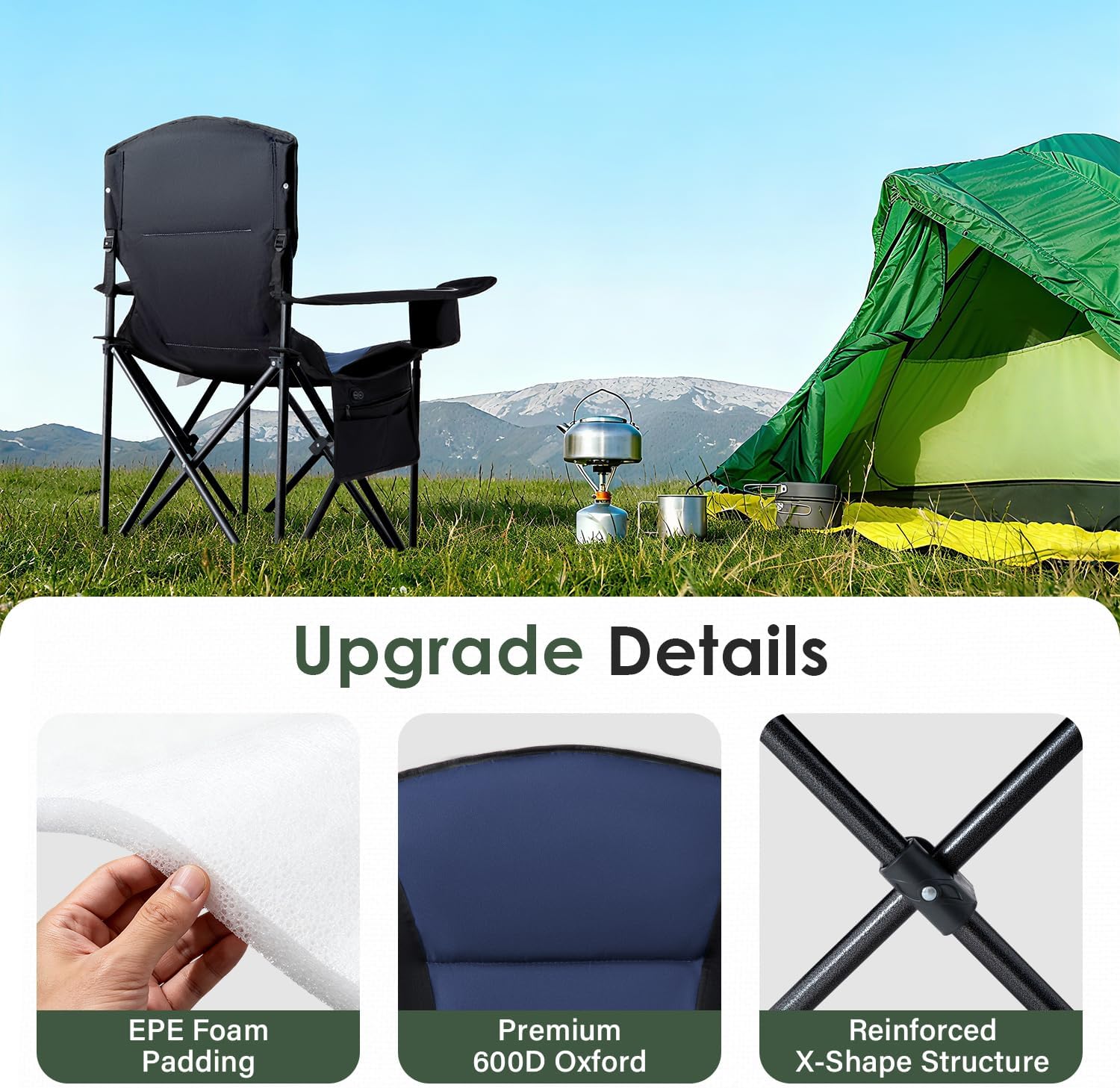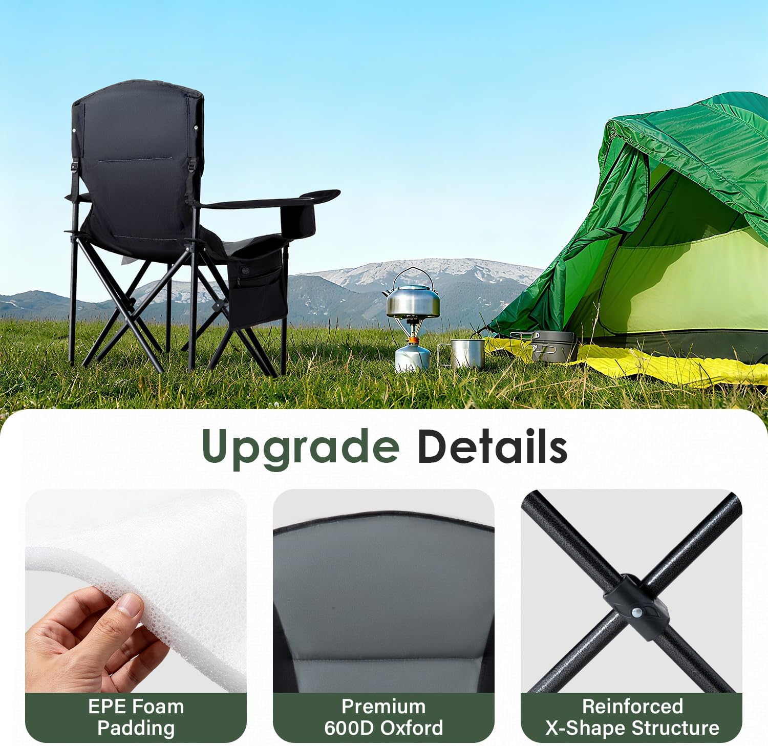 - Durable & Sturdy: The outdoor heated chair is made with sturdy 600D oxford material, which is comfortable and breathable. The reinforced X-shaped steel frame can support up to 500 pounds