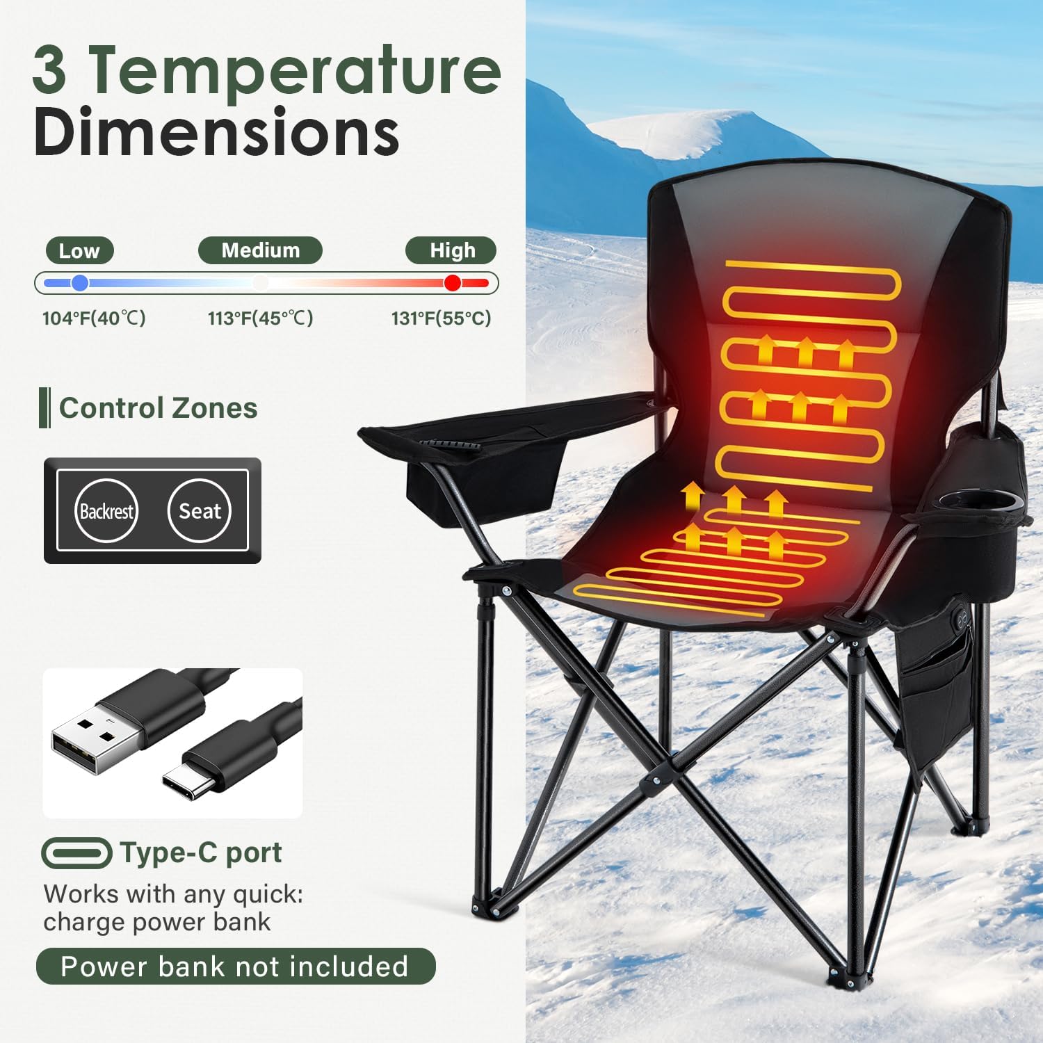 - 3 Temperature Settings: Our camping chairs desiged with 3 heating modes (104°F/113°F/131°F) to meet your needs. Compatible with any USB battery pack. Note: Batteries are not included
