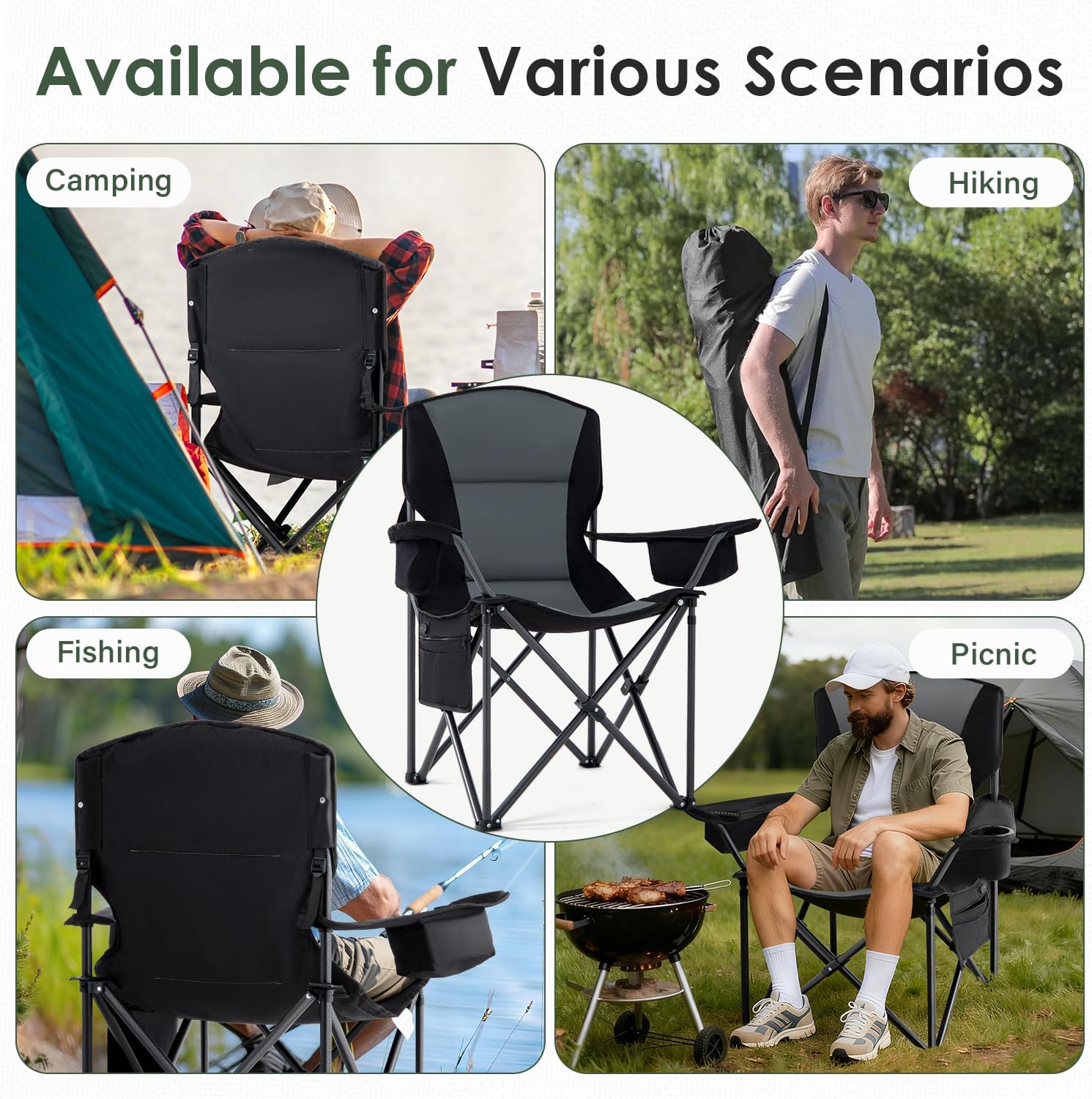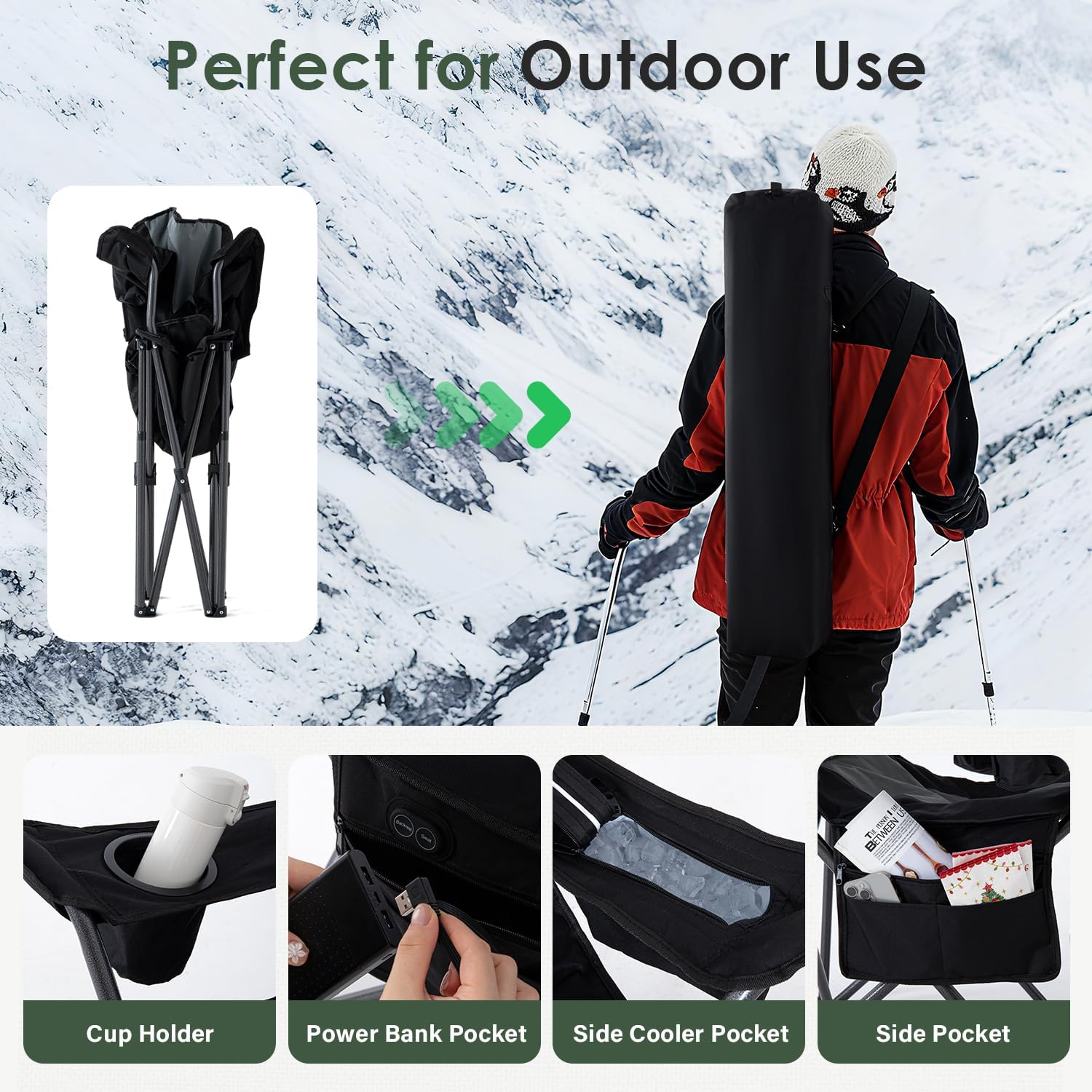 - 4-in-1 Storage: The folding chair is fully equipped. Inlusted cooler, dedicated battery storage, cup holder, and a carry bag. Ideal for camping, picnic, fishing, and more