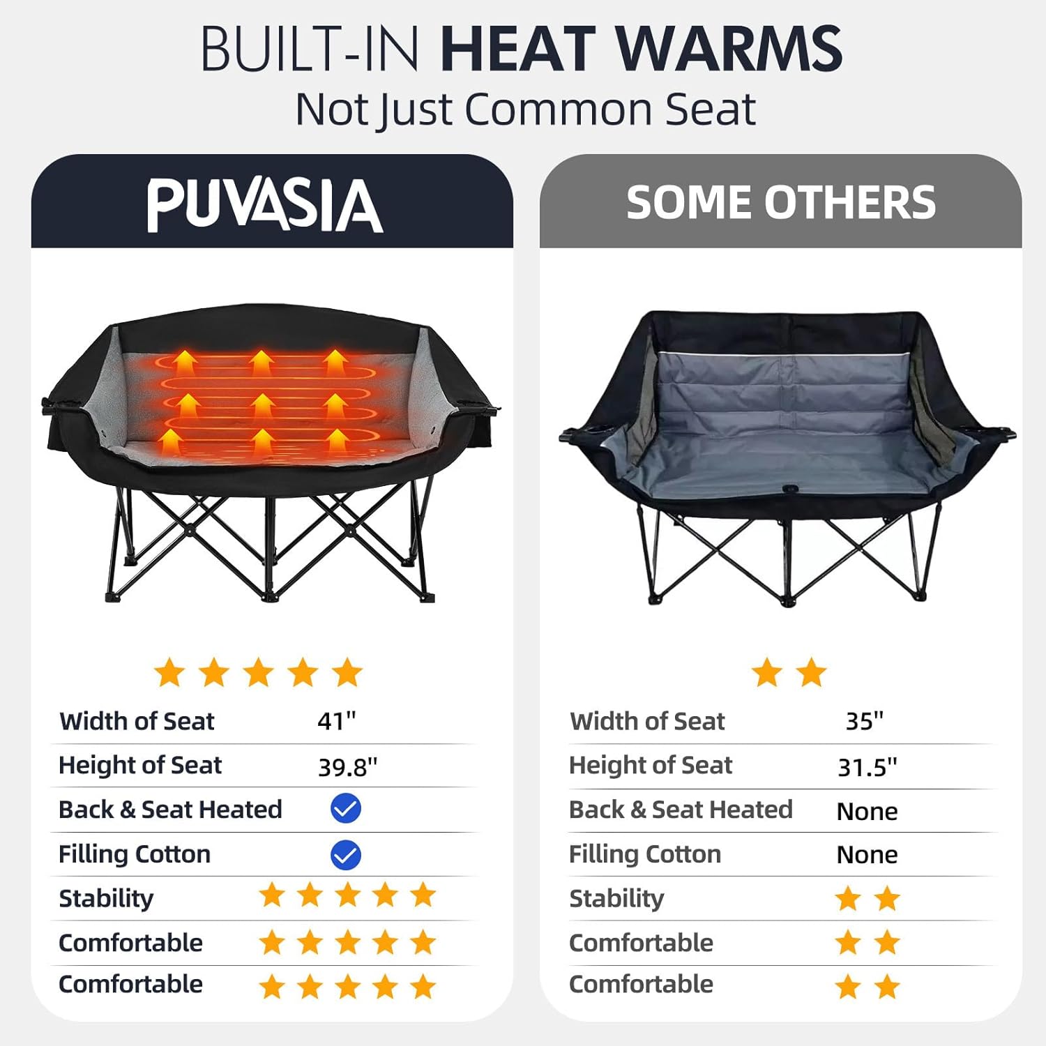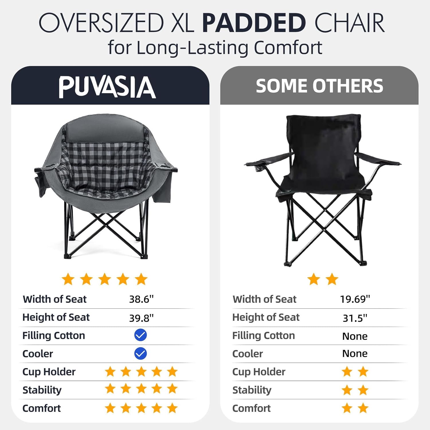 - Oversized Padded Comfort - PUVASIA oversized camping chair heavy duty is designed with extra-wide 38.6" x 23.1" seating area with multi-layer high-density padding. Ergonomic lumbar/neck support and padded headrest deliver all-day comfort.