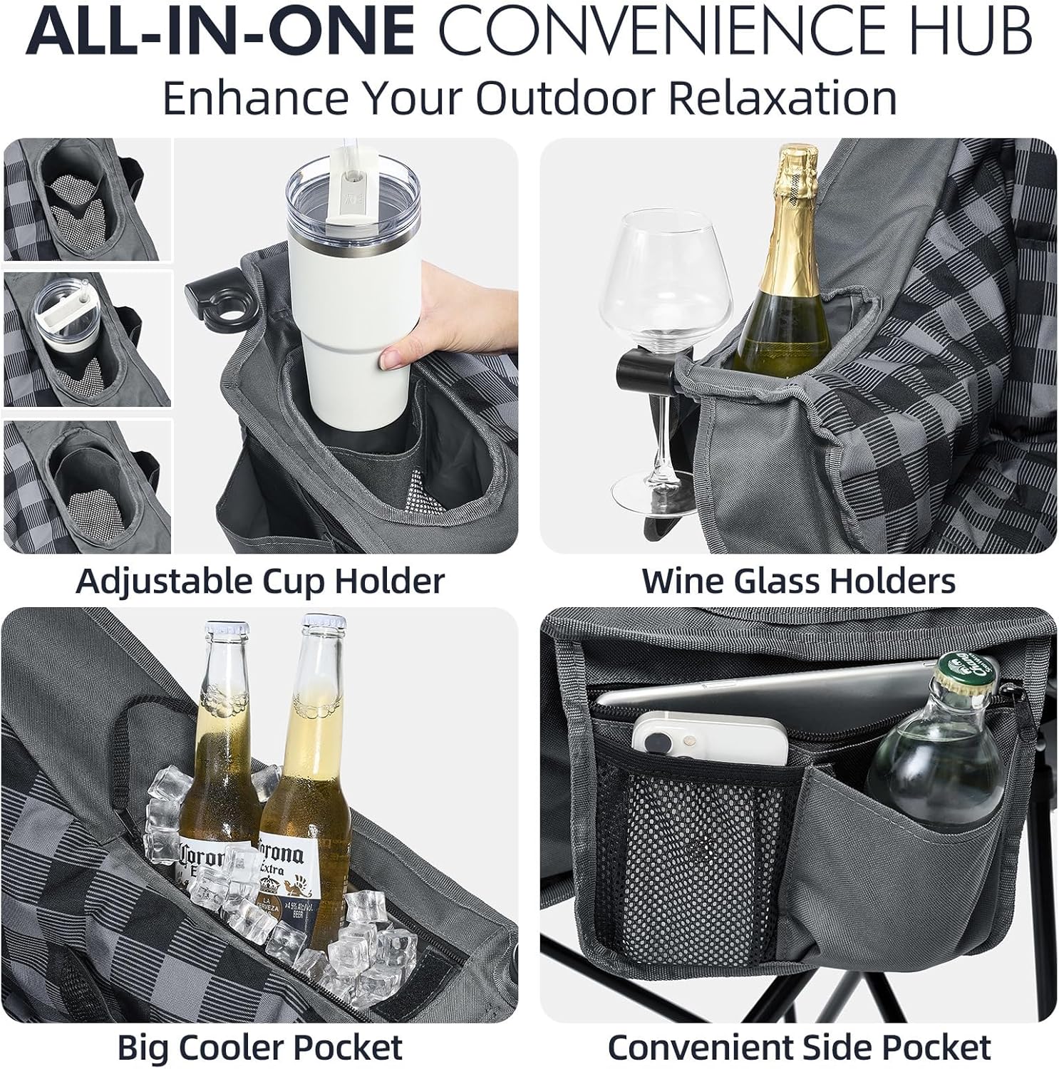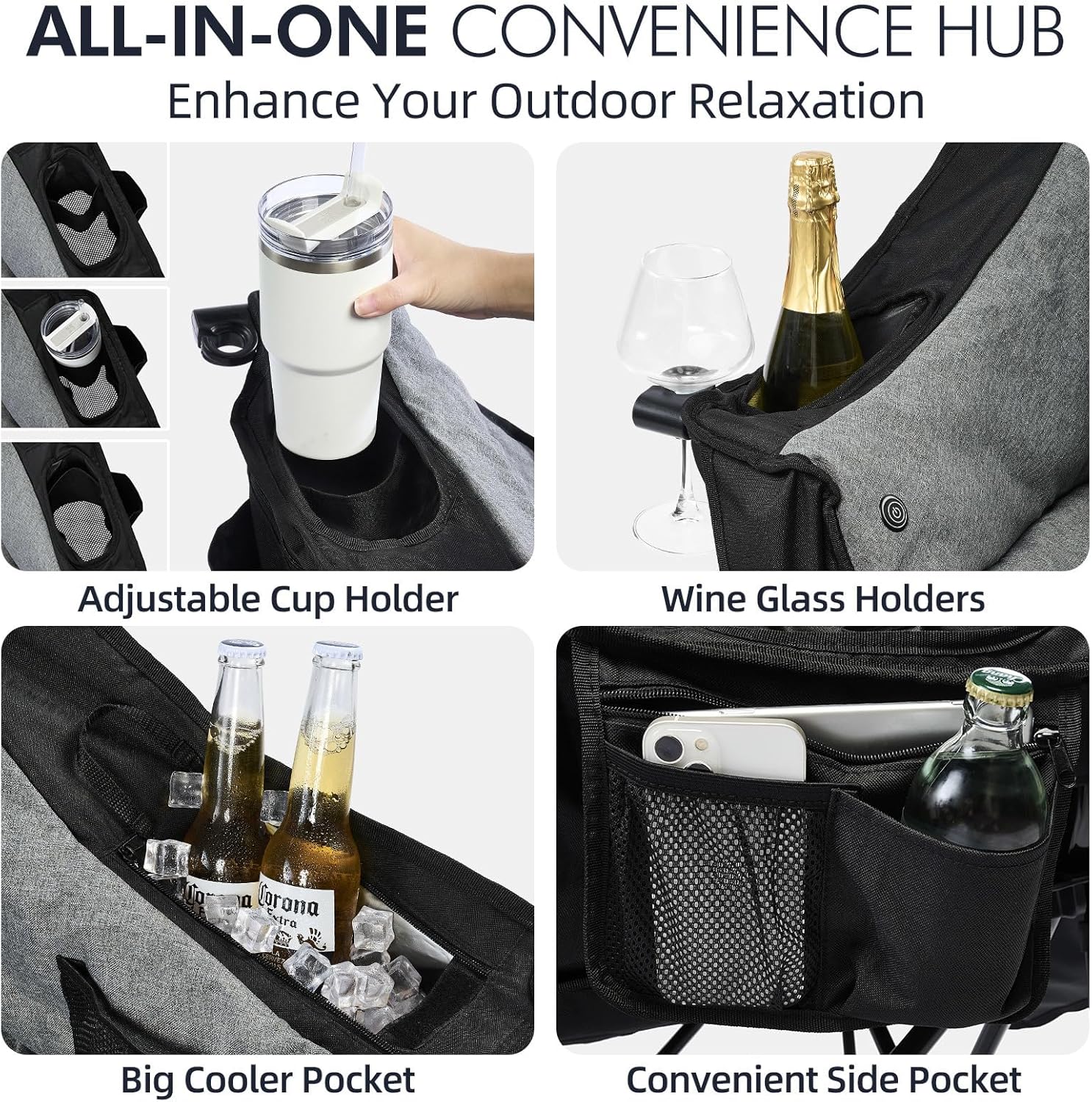 - Extra Storage Space - Our foldable chairs for outside features side/back mesh pockets, along with adjustable cup holder and large insulated cooler bag. Perfectly stores drinks, snacks, and phones within easy reach. It a versatile choice for comfortable padded camping chair for adults.