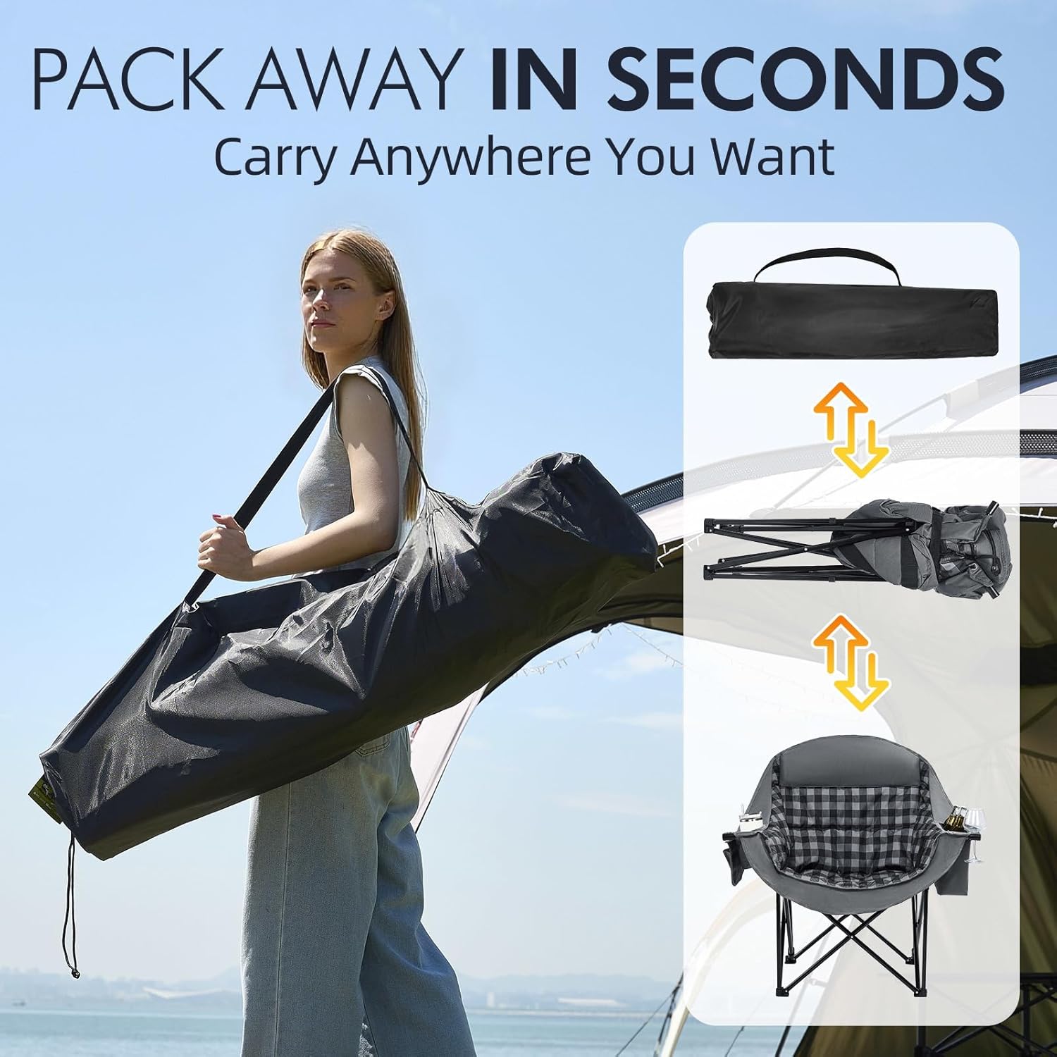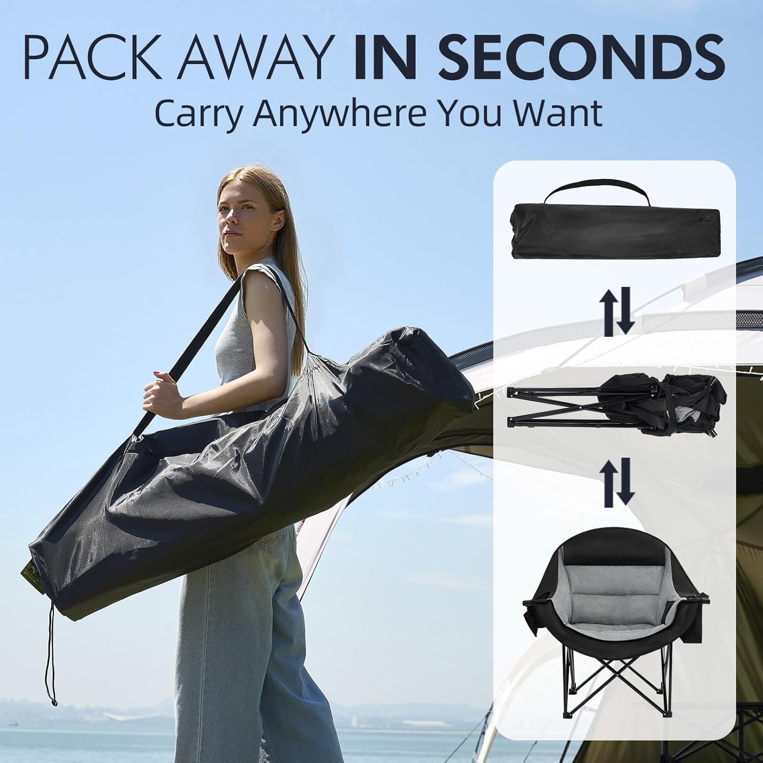 - Portable & Quick Setup - Folds flat to 9.4" thick (only 12.9 lbs with carry bag). Sets up in 3 seconds for picnics, concerts, tailgates, or home use. The compact structure of our lightweight beach chairs allow for easy folding and storage in the carrying bag after any outdoor activity.