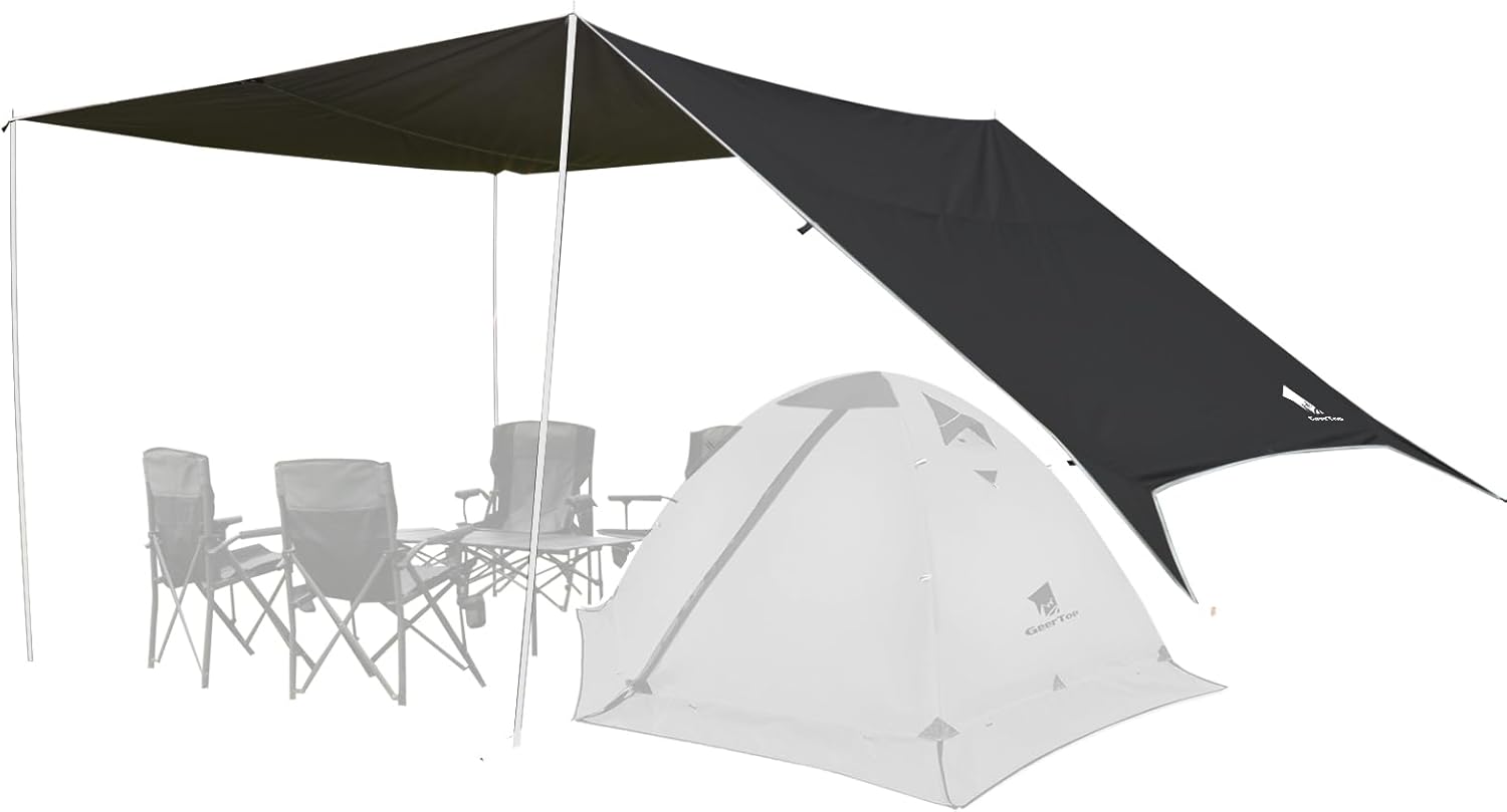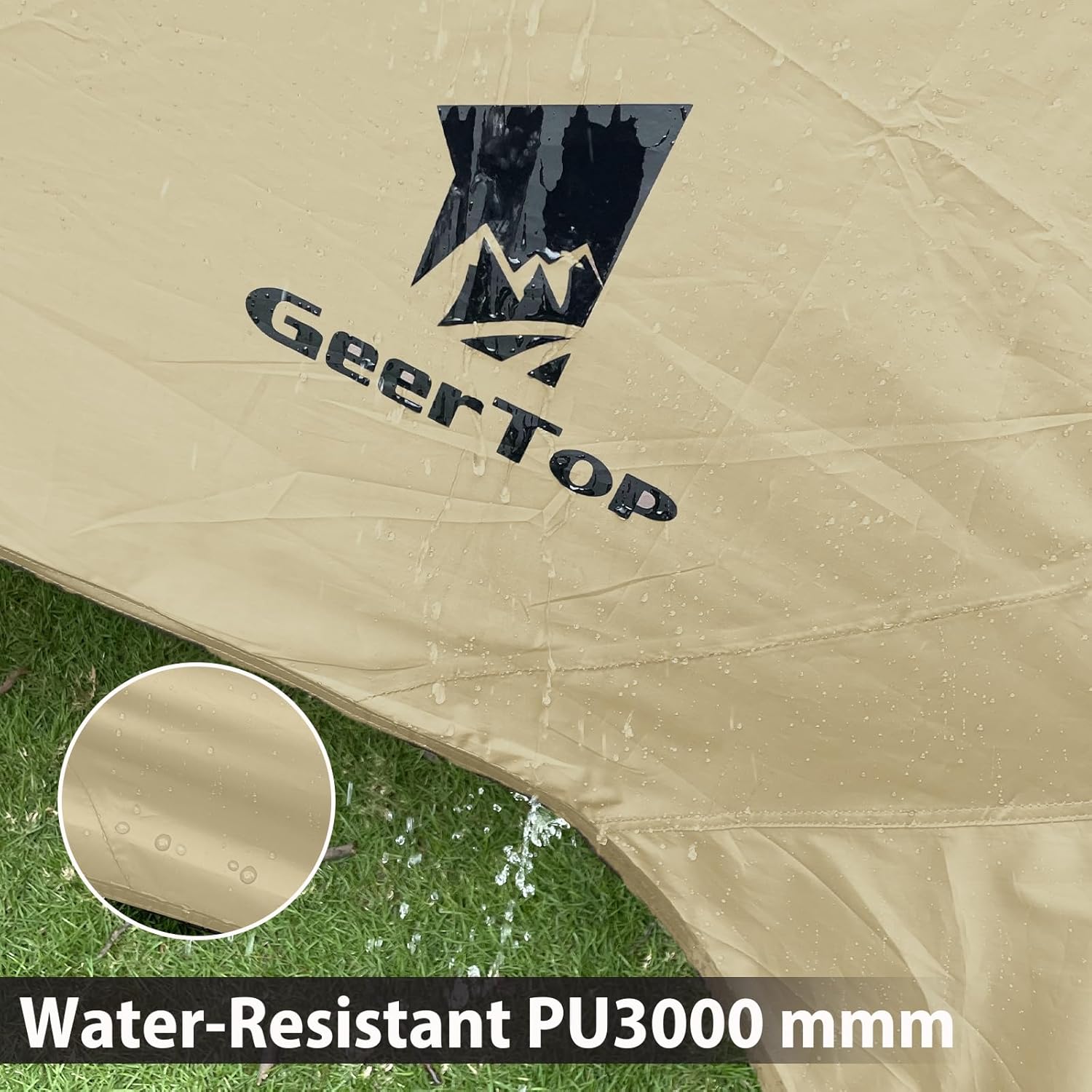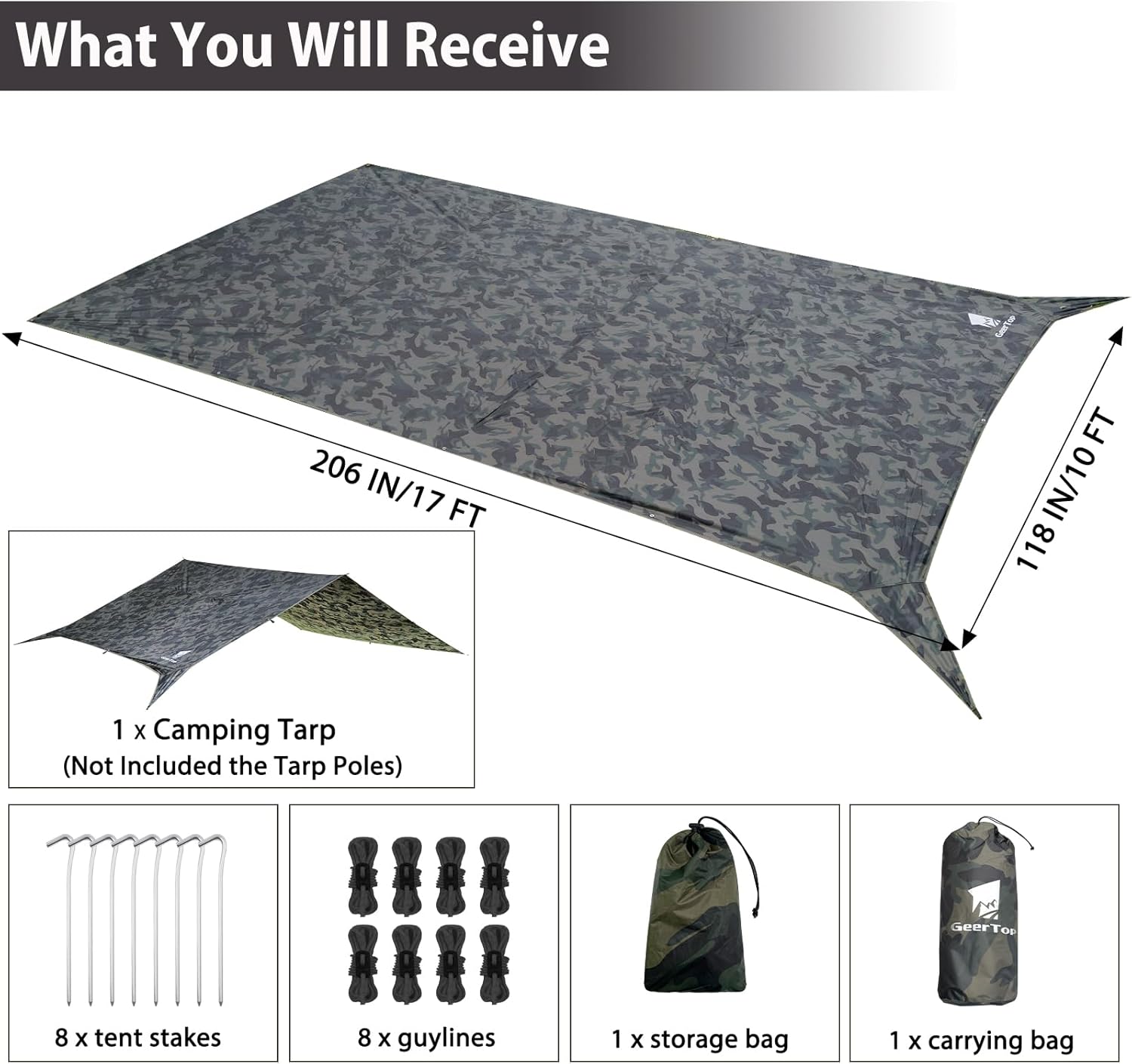 - Large Camp Tarp Size: The GEERTOP camping tarp measures approximately 17.2 x 10 ft and weighs only about 3.3 lbs. It’s lightweight yet large enough to fully cover a 4-person tent, double hammock, or standard car easily. Note that tarp poles are NOT INCLUDED