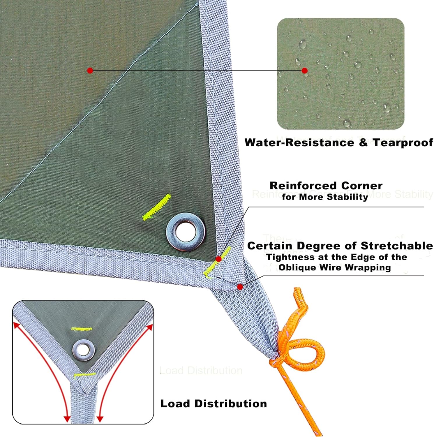 - Waterproof/UV Resistant: Made from thickened 210 T polyester fabric, this tarp features PU3000 mm water resistance and UV50+ protection, keeping out wind and rain to keep your tent and camping gear dry