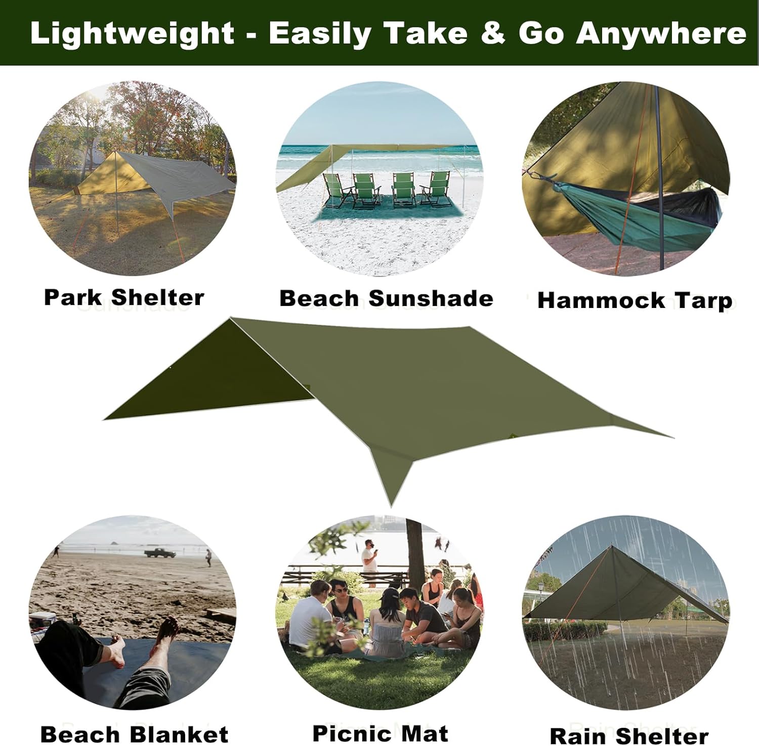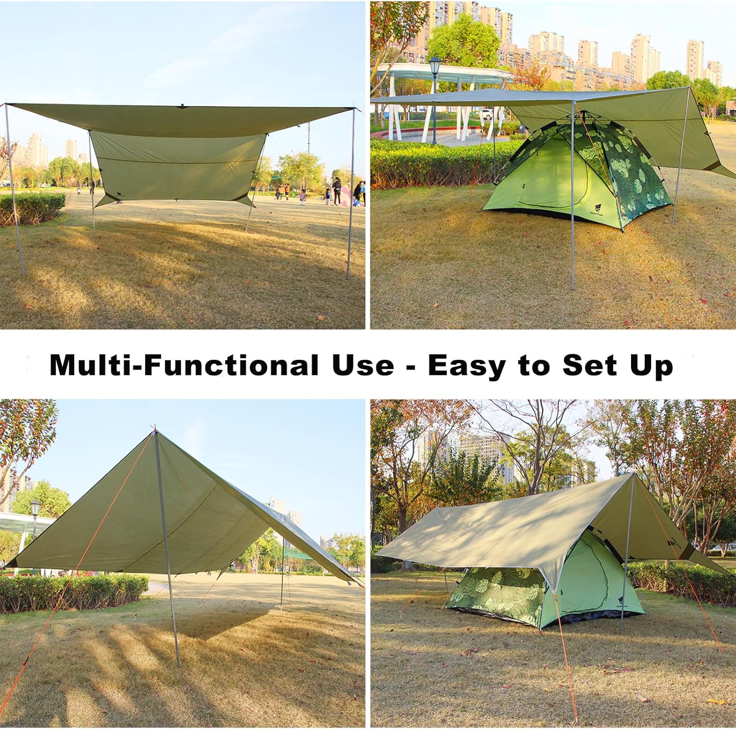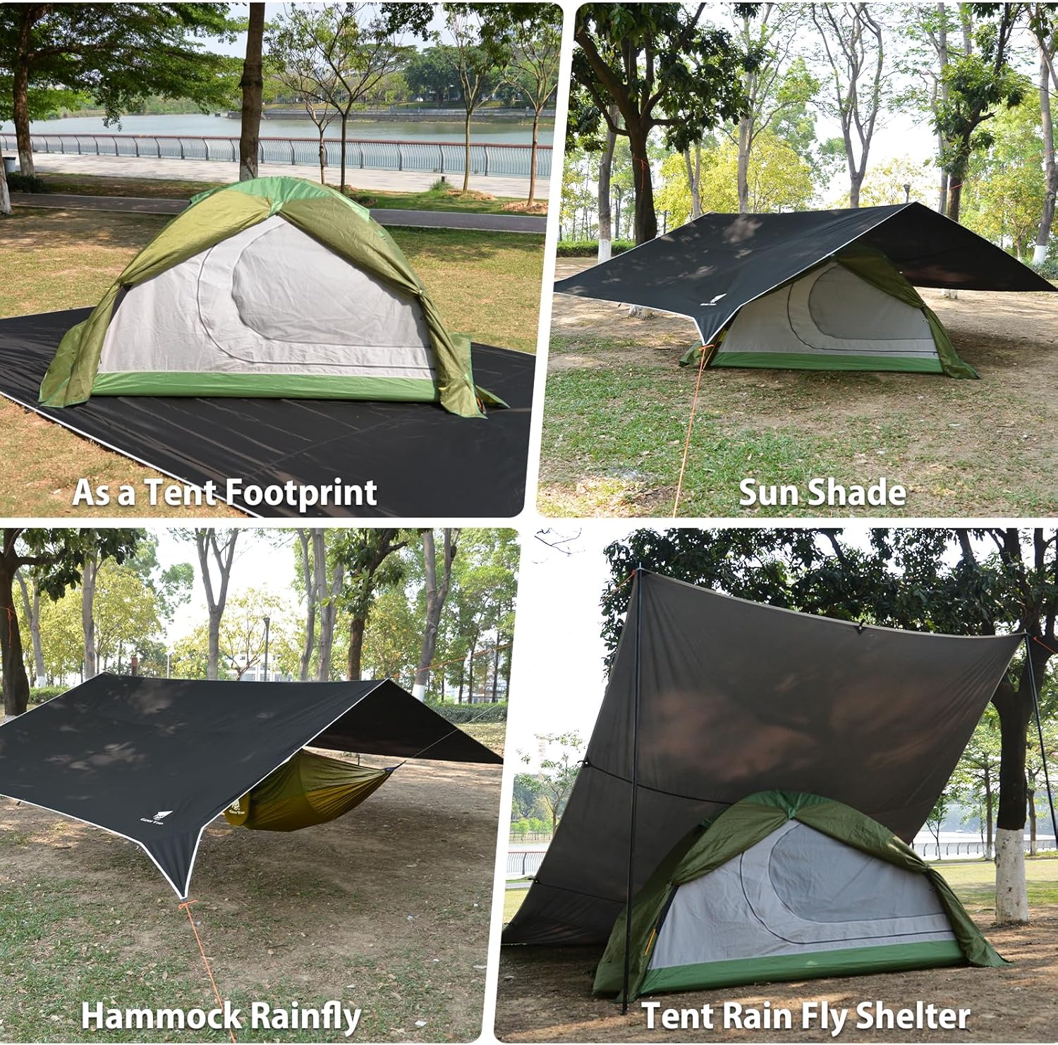 - Easy to Set Up & Steady: This backpacking tarp comes with 8 reflective ropes and 8 aluminum stakes for quick setup in just minutes. Use it with your camping tents and hammocks for a cool resting environment. Note that tarp poles are NOT INCLUDED