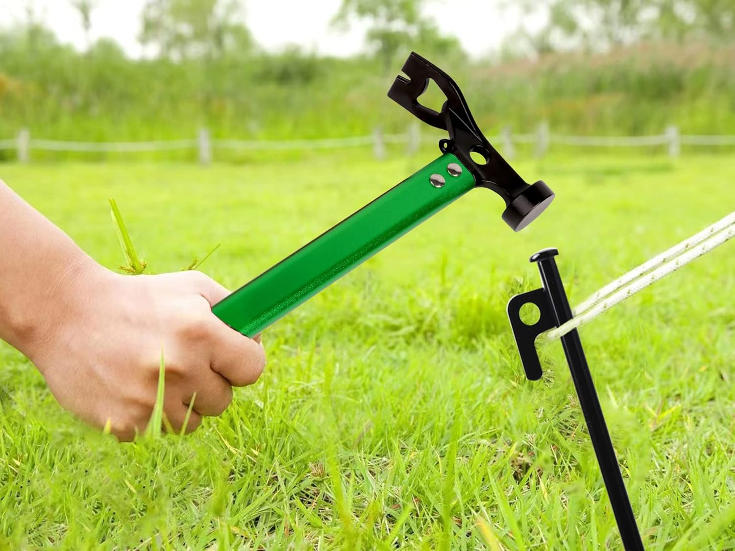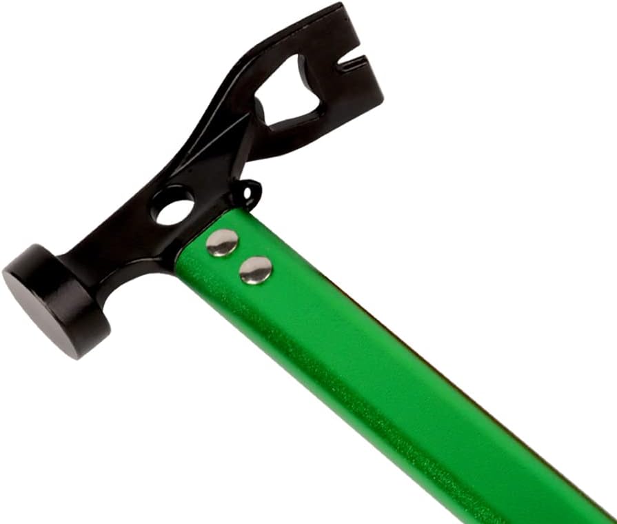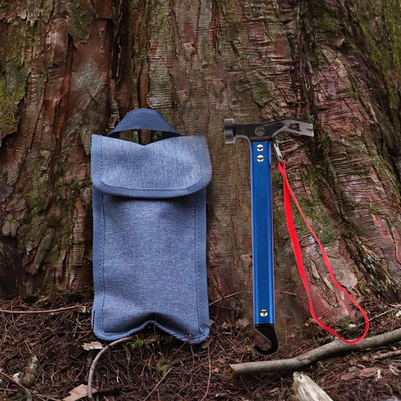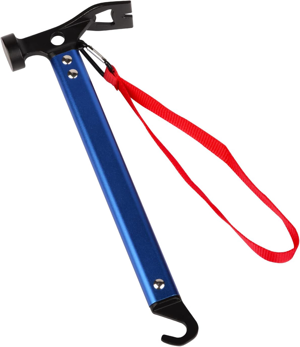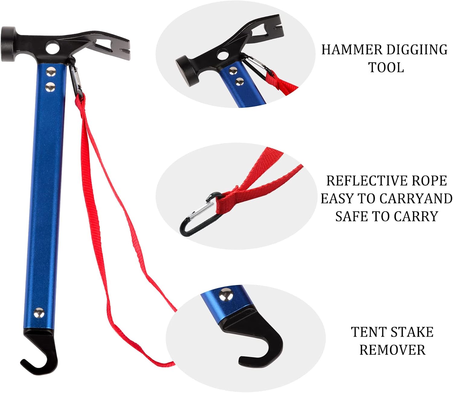 • 🔨Three-in-one Function: We have upgraded the camping hammer.The camping hammer's head could be used to dig soil or hammer a nail.The middle part can be used as a corkscrew. The hook at the back is used to pull out the stake, the hole in the middle hammer is for tying the straps. Only 13.4 oz, easy to carry and convenient to use.
