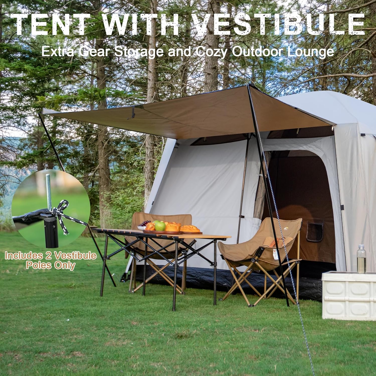 • EXPANDABLE PORCH DESIGN: Easily support the front and side doors with poles to create a spacious porch area for relaxation or gear storage. When not in use, simply roll up and secure it with olive cordlocks. Ideal for camping, picnics, or outdoor events. Note: The package includes 2 support poles only, the other 2 poles need to be purchased separately or replaced with tree branches