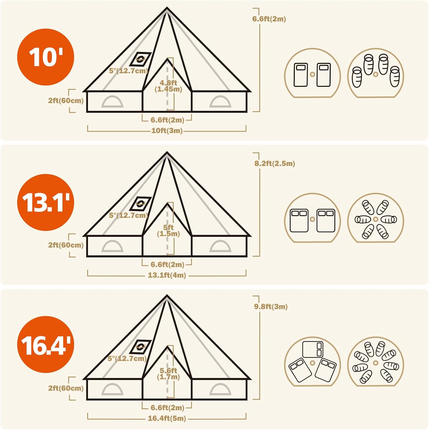 • 🏕️【Spacious Space】 Waterproof, with diameter 10ft(3M)/door height 4.8ft(1.45m)/top height 6.6ft(2m)/side wall 23.6in(60cm), you can easily get in and out and move around freely inside without stooping, this bell tent suitable for 2-3 peoples.