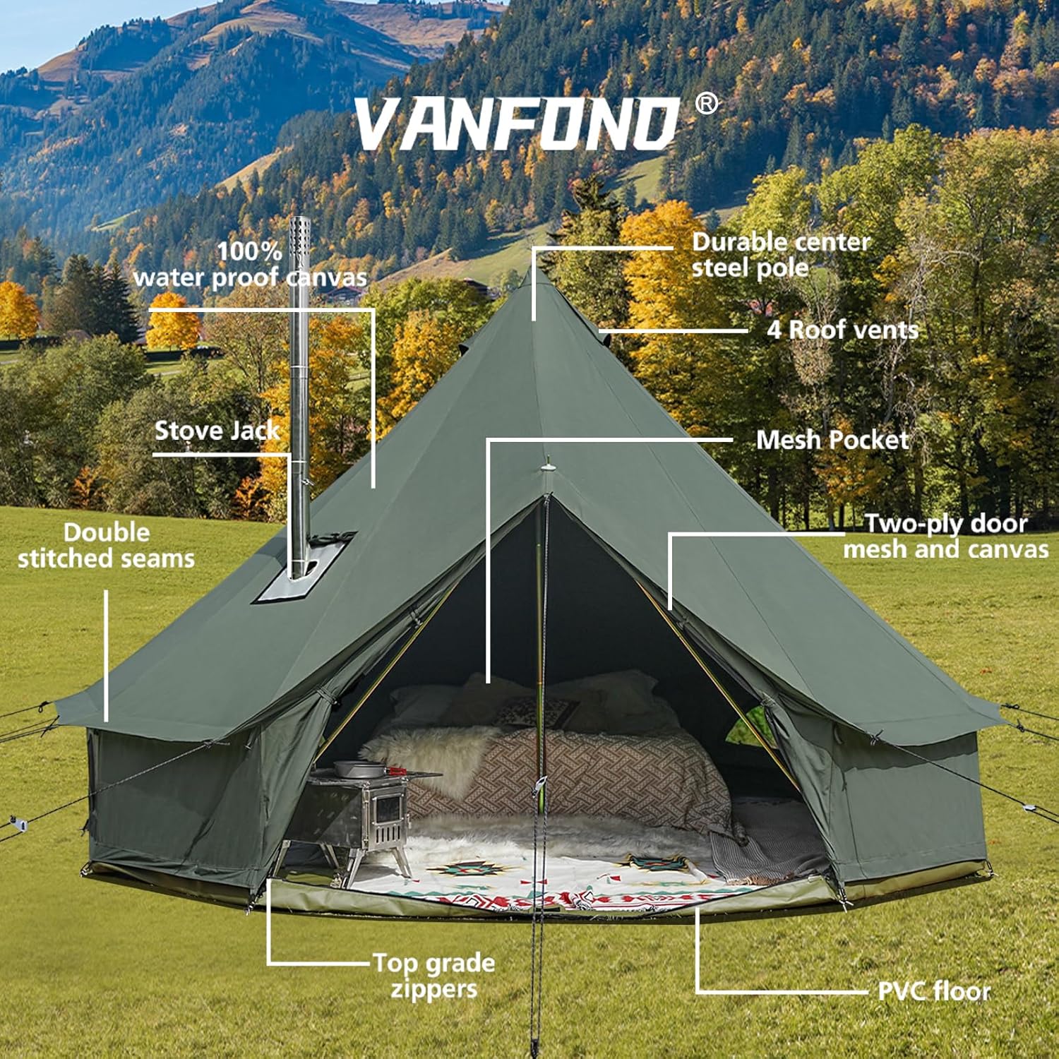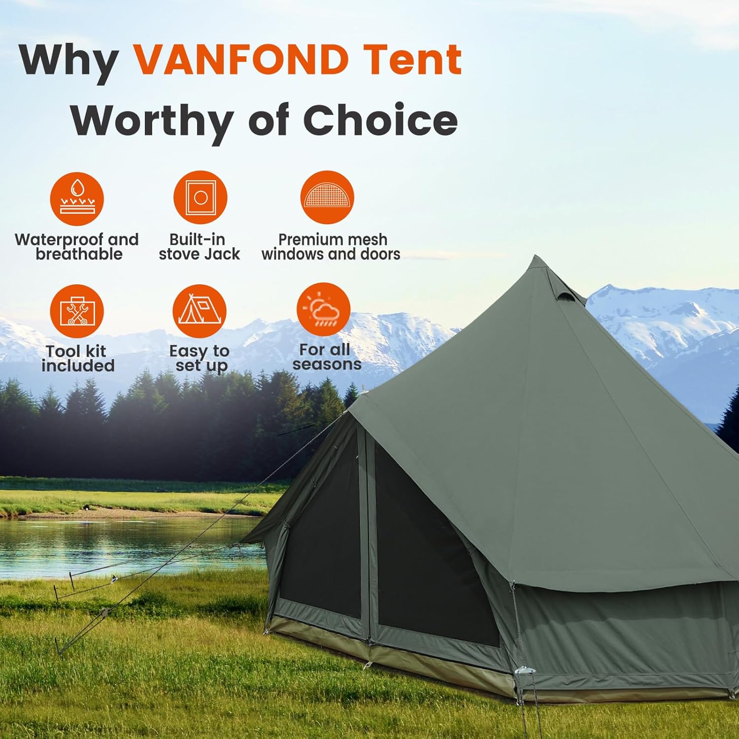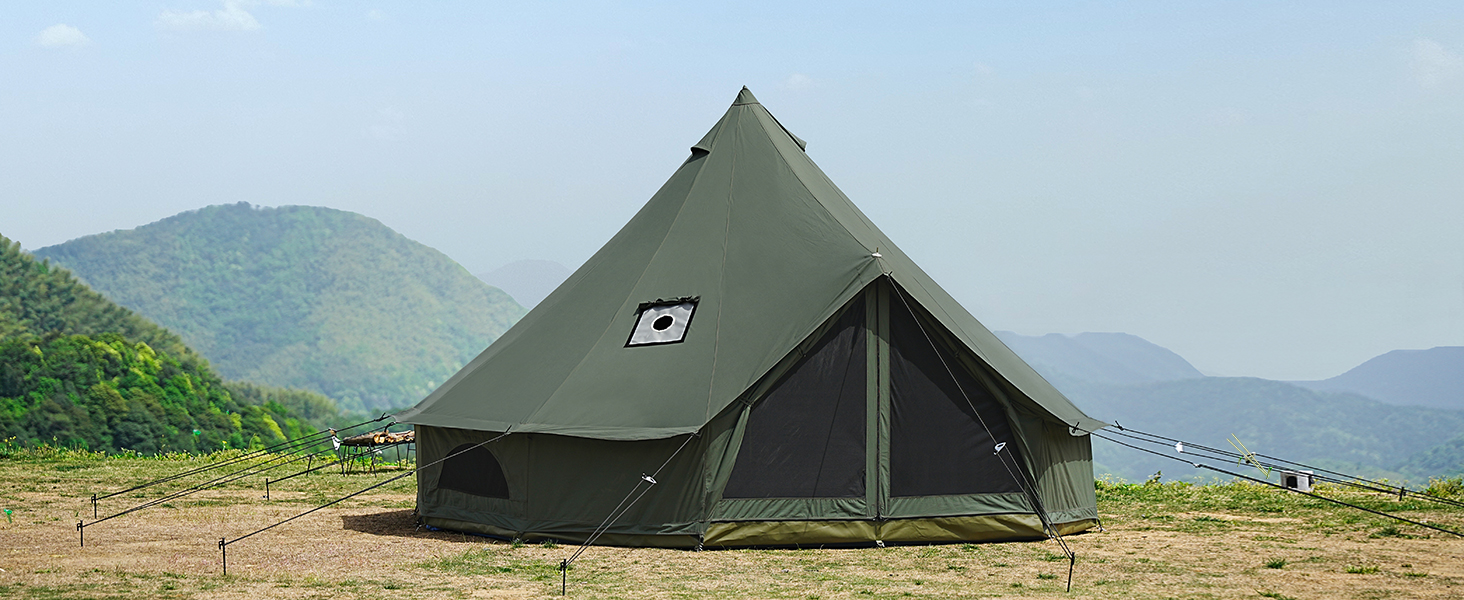 • 🏕️【Bell tent with Stove Jack】Our glamping tent is not only waterproof but also highly breathable, ensuring a comfortable and dry camping experience in any weather. The 5'' stove Jack on the top made from fire retardant material, ensuring safety during heating and won't take too much space.