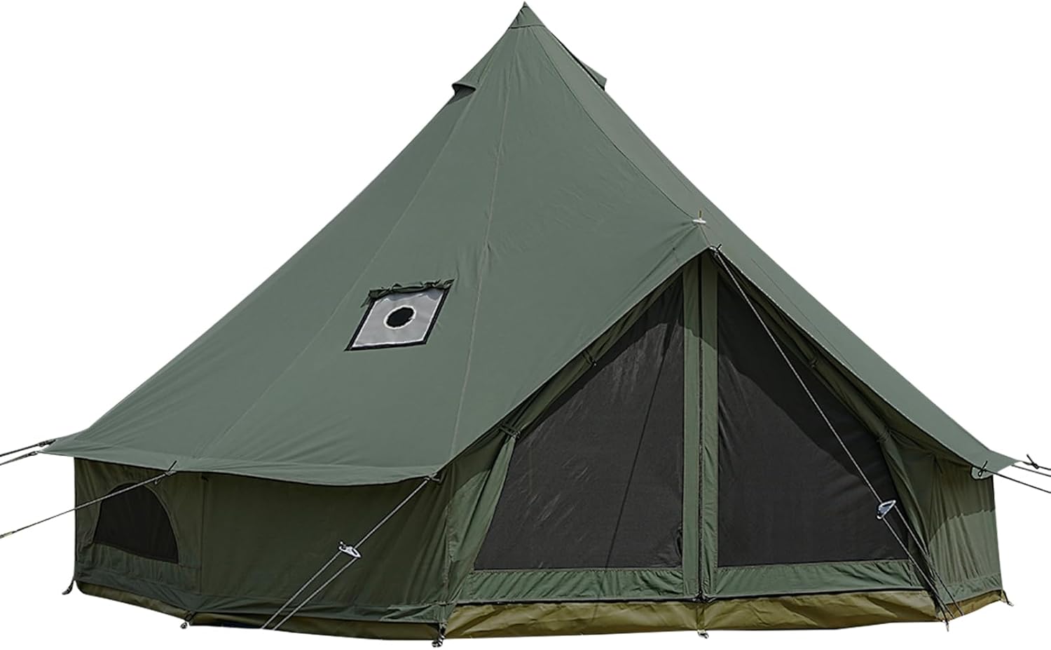 • 🏕️【Complete Package】Our yurt tent comes with a high-quality sewn-in PVC groundsheet, a 5'' wide stove jack opening, standard mesh door, 4 windows and roof vents to increase air circulation, galvanized steel center pole and A-frame pole. Additionally, the canvas tent comes with a tool kit that includes stakes, pegs, a rain cap, and a rubber mallet.