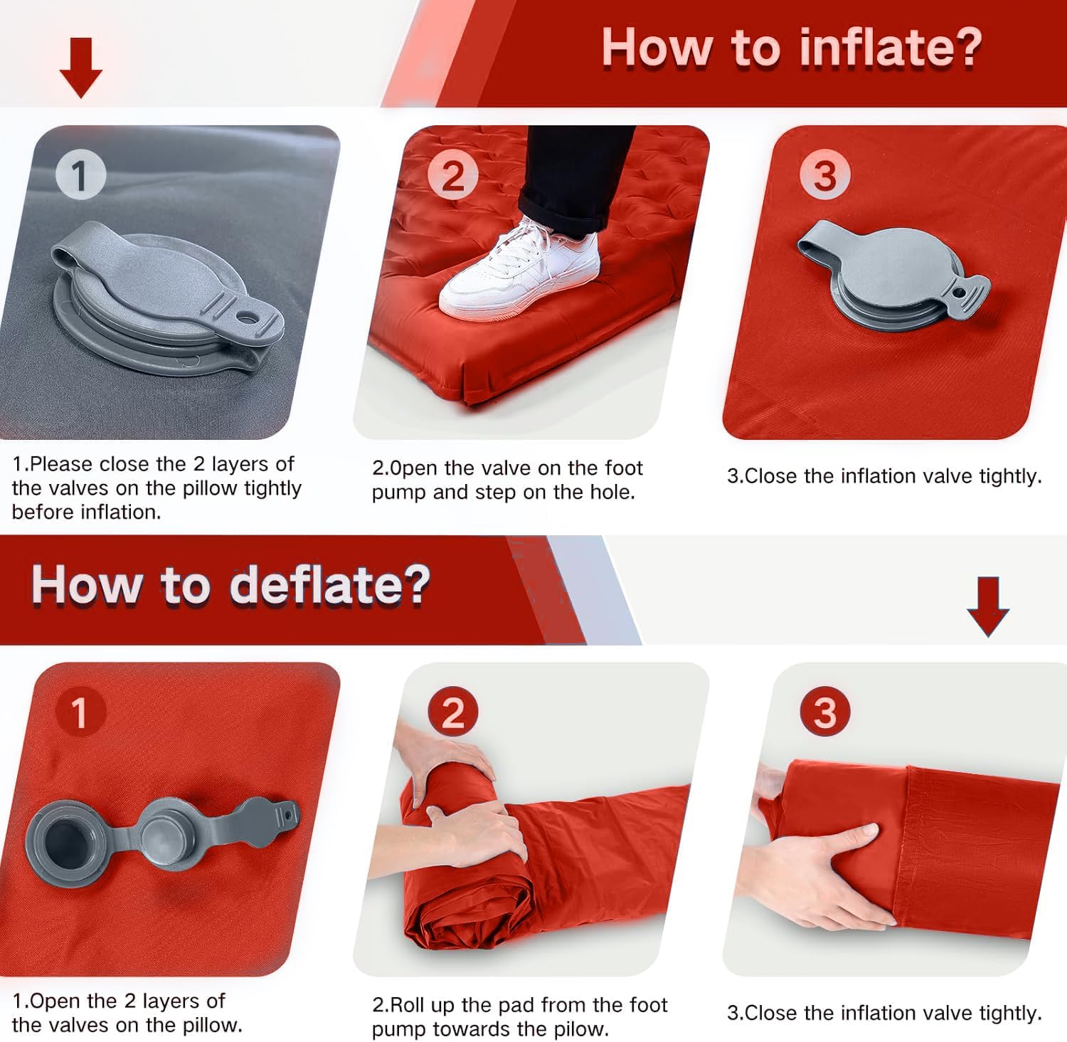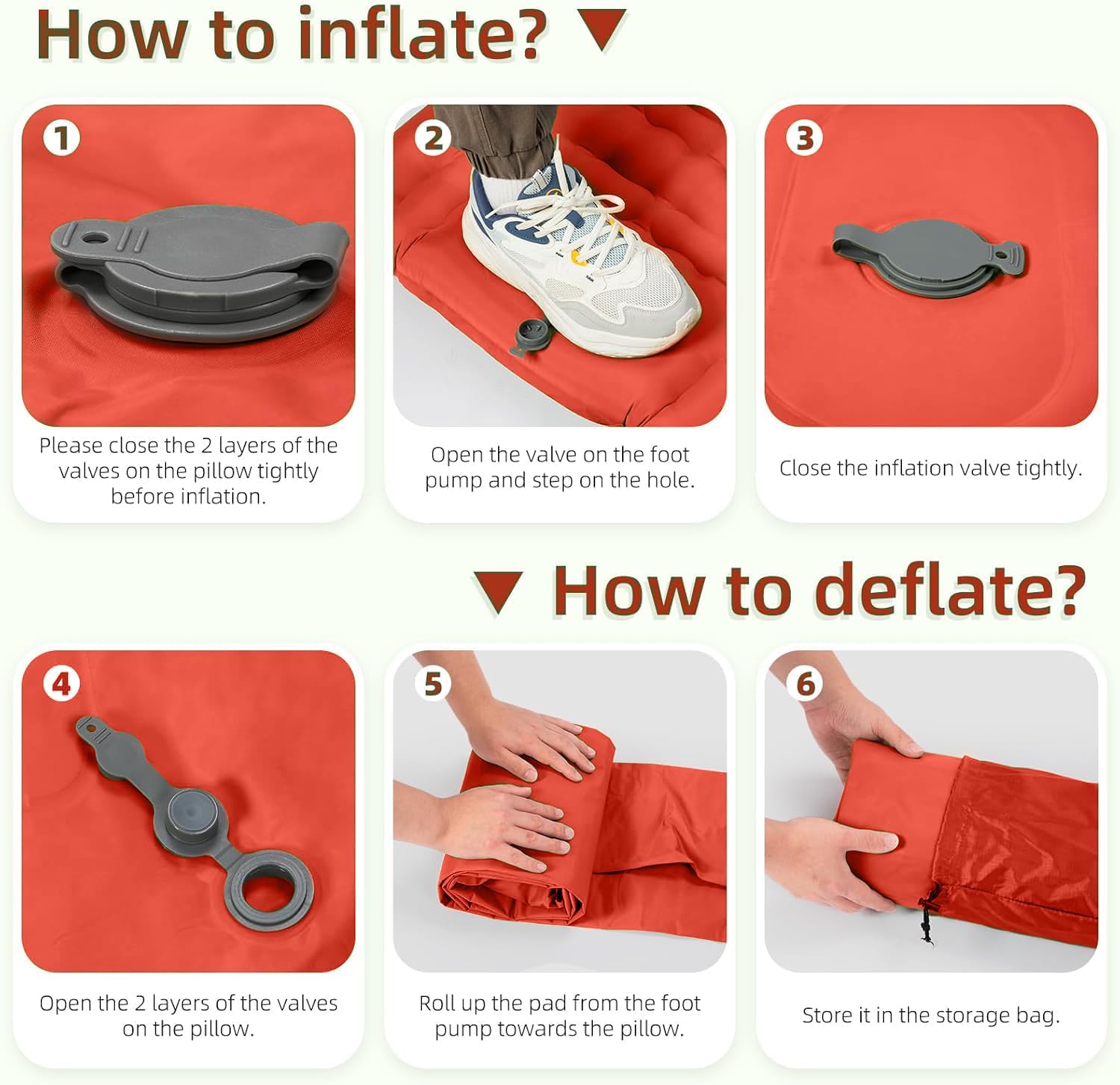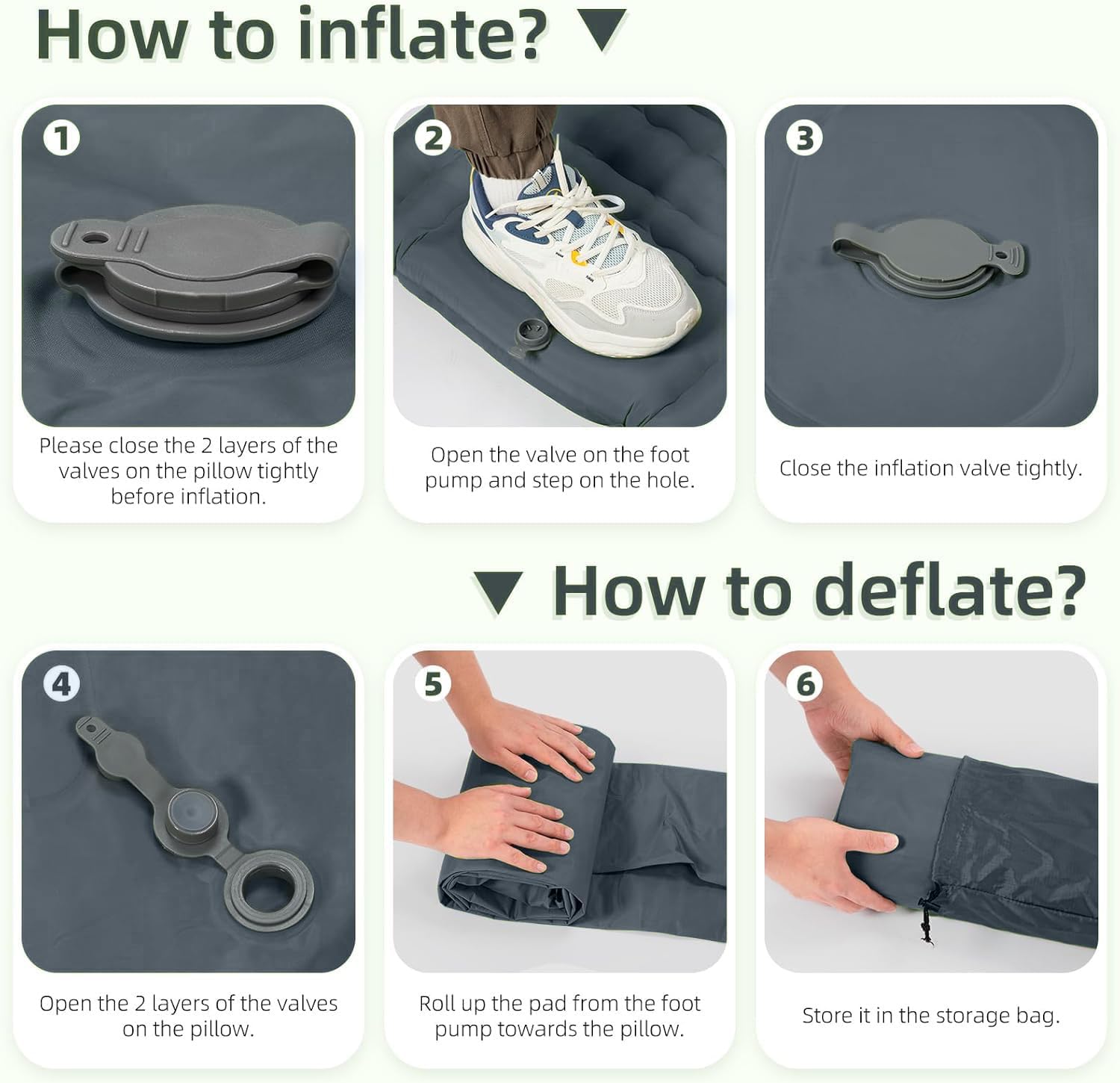 - 30s Foot Pump Inflation & 1s Deflate - No hand pump! Built-in foot pump inflates in half a minute. Upgraded no-leak valve ensures all-night firmness.